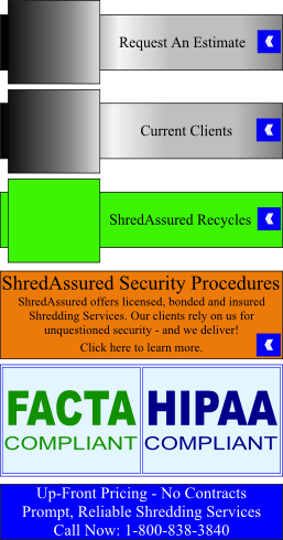 Give us a call at 1-800-838-3840 to find out how ShredAssured can help your company save money, protect its information, and comply with federal and state laws. Our client specialists are ready to assist and willing to help in any way they can.